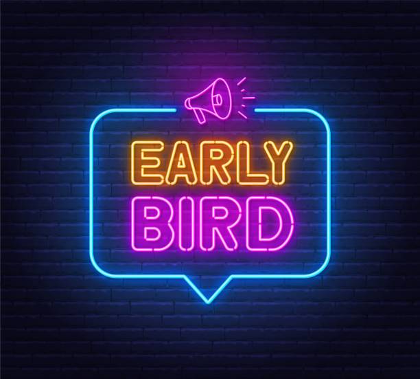 Early Bird neon sign in the speech bubble on brick wall background .